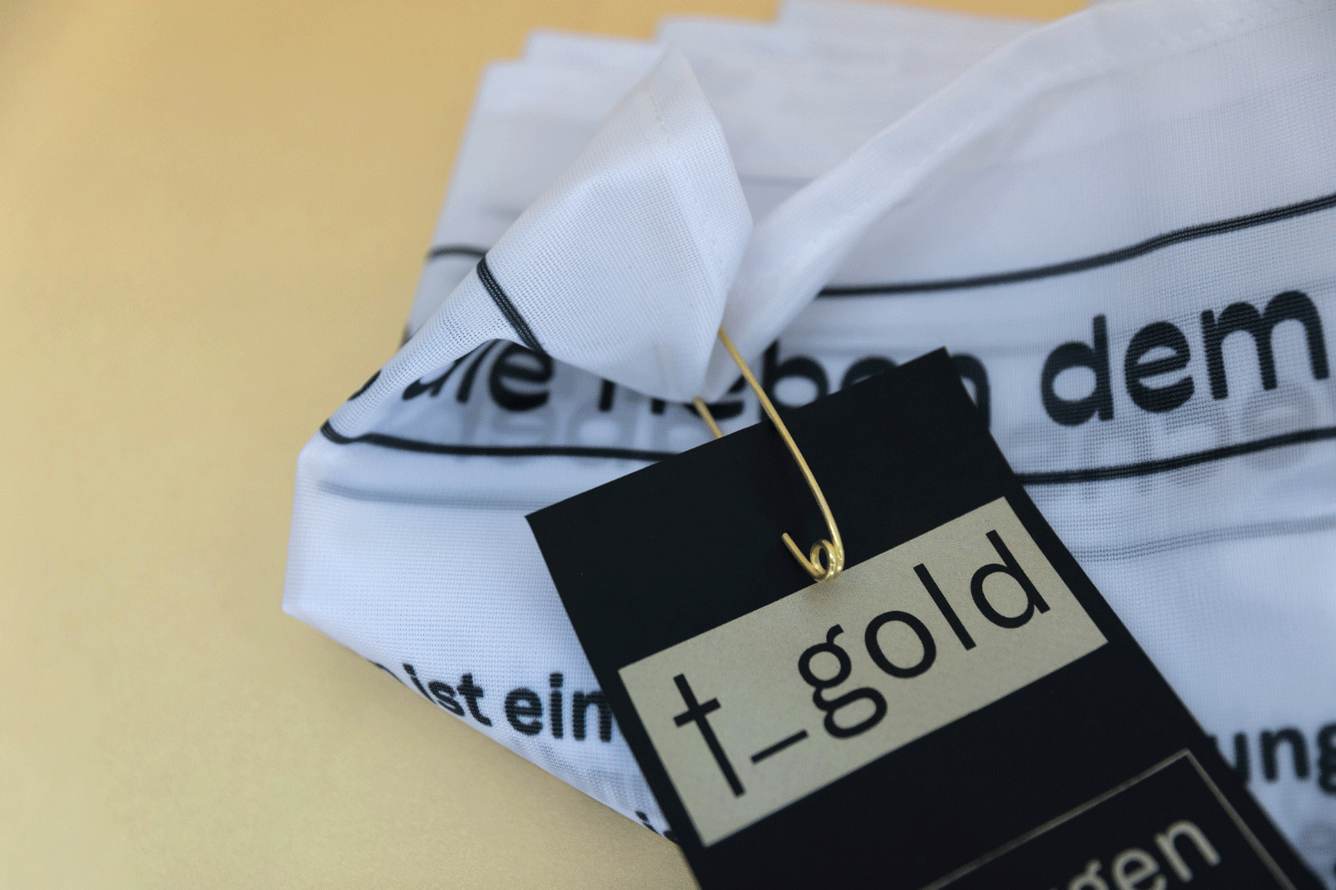The objects of the brand dead_gold are everyday objects. The first collection consists of blankets, flags and towels. Each group of objects was produced especially for one group of individuals. Not their design refers to the respective group of individuals, but the content depicted on them. Each object asks where we feel safe and secure, where we find orientation and when and how we can express ourselves. The materiality emphasizes the content of the objects. Since there are many different—and not necessrily golden—golden calves today, the objects of the brand dead_gold show several products from the online-shop amazon at the same time. These might appear as golden calves. In the identical representation of the different products they appear as a homogeneous group. Thus the objects can call for acceptance and tolerance in between people.